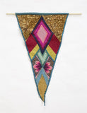 Hand embroidered wall pennant, featuring a vivid motif designed by Swoon, and sewn by Myrtha Louis Marc & Junia in Cormiers, Haiti. Signed on the back by Swoon.