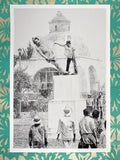 The drawing depicts an indigenous group toppling a statue of the Spanish conquistador Diego de Mazariegos on the 500th anniversary celebration of Columbus Day.